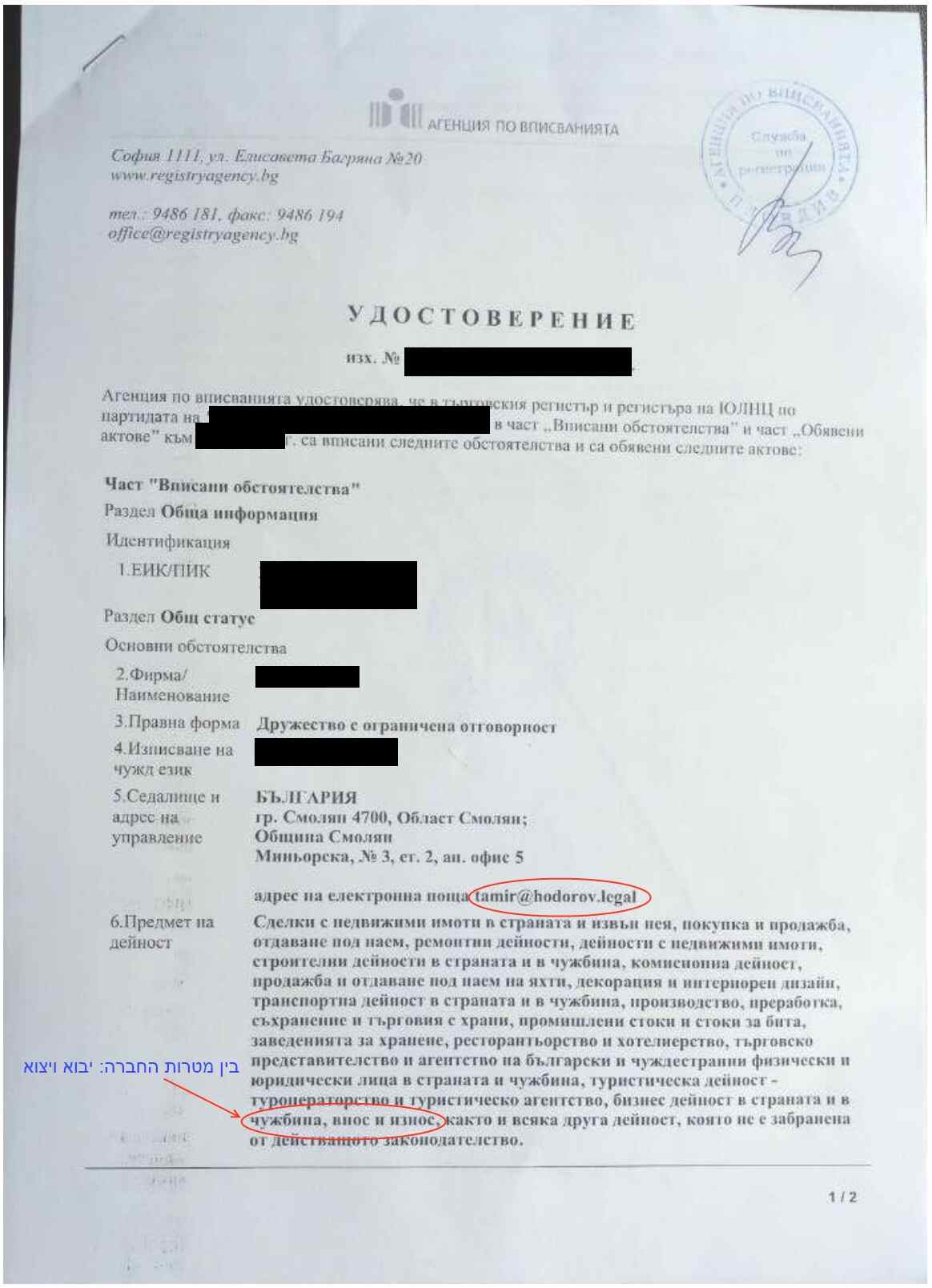 לאחר פתיחת חשבון הבנק והפקדת ההון העצמי, החברה נפתחת ומונפקת "תעודת רישום" (תעודת ההתאגדות הבולגרית), כמו זאת שהוצאנו: